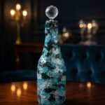 Handcrafted mosaic decorative bottle featuring a captivating blend of shimmering turquoise, black, and clear glass shards with a sparkling crystal faceted stopper. A luminous piece of art that adds elegance, depth, and artistic charm to any space.