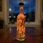 Mesmerizing handcrafted lighted bottle featuring vibrant orange, red, and black abstract patterns with a warm, glowing base light. A luminous piece of art that brings fiery energy, depth, and artistic ambiance to any space.