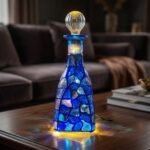 Dazzling handcrafted lighted decanter in deep blue mosaic glass, glowing with warm golden light. Finished with a radiant glass orb stopper, it adds luxurious sparkle and magical ambiance to any space.
