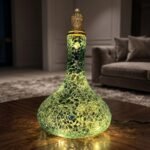 Stunning handcrafted lighted bottle covered in shimmering turquoise and black mosaic glass that glows with a soft, ethereal light. Finished with an elegant clear glass stopper, this luminous piece brings calm, sophisticated sparkle and serene ambiance to any space.