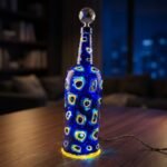 Glass bottle with blue painted pattern and globe stopper. Comes with lights.