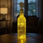 Glowing handcrafted lighted bottle covered in shimmering golden-yellow mosaic glass that radiates a warm, magical light. Finished with an elegant stacked crystal stopper, this luminous piece adds luxurious sparkle and cozy ambiance to any space.