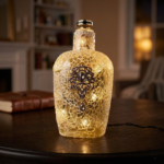 Vibrant handcrafted lighted bottle bursting with fiery red, blue, yellow, and green abstract patterns that radiate a dazzling multicolored glow. Topped with a sparkling crystal stopper, this luminous piece of art creates a joyful, energetic ambiance and instantly becomes a stunning focal point in any space.