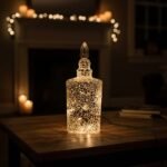 Dazzling handcrafted lighted decanter in deep blue mosaic glass, glowing with warm golden light. Finished with a radiant glass orb stopper, it adds luxurious sparkle and magical ambiance to any space.