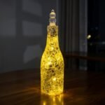 Glowing handcrafted lighted bottle covered in shimmering golden-yellow mosaic glass that radiates a warm, magical light. Finished with an elegant stacked crystal stopper, this luminous piece adds luxurious sparkle and cozy ambiance to any space.
