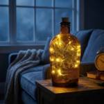 Authentic vintage-style amber glass bottle lamp embossed with intricate Bib & Tucker label details, filled with warm golden fairy lights that create a cozy, nostalgic glow perfect for whiskey-inspired decor and relaxed evening ambiance.
