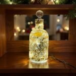 Glass bottle with teal fireglass, clear stopper, and seaglass detail. Comes with lights.