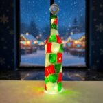 Red, green and white painted glass bottle with clear, globe stopper. Comes with lights.
