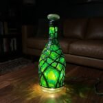 Green painted glass bottle with leading design and sea glass accent. Comes with a glass stopper and lights.