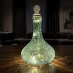 Bell-shaped glass bottle with teal fireglass and rhinestone-encrusted stopper. Comes with lights.