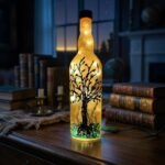 Gold painted glass bottle with landscape design and wooden top. Comes with lights.