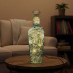 Multi-colored painted glass bottle with blue-painted neck and a decorative glass stopper. Comes with lights.
