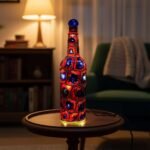 Blue and red painted glass bottle with blue, dome-shaped stopper. Comes with lights.