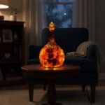 Burnt orange and black painted glass bottle with dark orange angular stopper. Comes with lights.