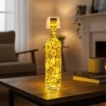 Burnt orange and black painted glass bottle with dark orange angular stopper. Comes with lights.