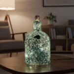 Vibrant handcrafted bottle lamp with swirling purple-pink-blue mosaic glass in a bold, iridescent cracked pattern, crowned by a sparkling disco ball stopper, casting dynamic multicolored glows from embedded fairy lights for a bold, cosmic party-inspired ambiance.