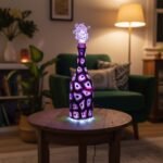 Green glass bottle with purple and dark purple panes. Panes appear green and amber when lit. Comes with lights.