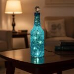 Glass bottle with teal fireglass, clear stopper, and seaglass detail. Comes with lights.
