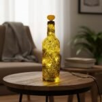 Glass bottle with teal fireglass, clear stopper, and seaglass detail. Comes with lights.