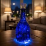 Captivating handcrafted deep blue mosaic bottle lamp with intricate textured glass pattern and elegant crystal-clear faceted stopper, emitting a serene oceanic glow from embedded fairy lights for tranquil, coastal-inspired nighttime ambiance.