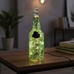 Green painted glass bottle with leading design and sea glass accent. Comes with a glass stopper and lights.