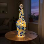 Whimsical handcrafted bottle lamp in vibrant yellow mosaic glass with playful abstract patterns accented by colorful dots and swirls, topped with a natural cork stopper, glowing warmly from embedded fairy lights for a cheerful, artistic, and uplifting ambient touch.