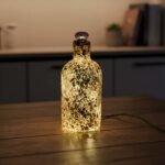 Glass bottle with teal fireglass, clear stopper, and seaglass detail. Comes with lights.