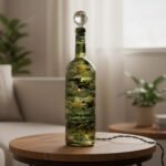Wine bottle with ink paint green, gold, silver. Round circular clear topper.